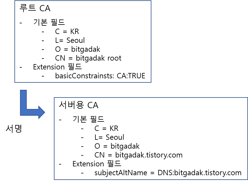 # openssl x509 -text -in root.crt Certificate: Data: Version: 3 (0x2) Serial Number: (...생략...) Signature Algorithm: sha256WithRSAEncryption Issuer: C = KR, L = Seoul, O = bitgadak, CN = bitgadak root Validity Not Before: Sep 10 01:48:21 2021 GMT Not After : Sep 8 01:48:21 2031 GMT Subject: C = KR, L = Seoul, O = bitgadak, CN = bitgadak root Subject Public Key Info: Public Key Algorithm: rsaEncryption RSA Public-Key: (2048 bit) Modulus: (...생략...) Exponent: 65537 (0x10001) X509v3 extensions: X509v3 Basic Constraints: CA:TRUE Signature Algorithm: sha256WithRSAEncryption (...생략...) -----BEGIN CERTIFICATE----- (...생략...) -----END CERTIFICATE-----extensiosn 도 잘 들어가 있다.