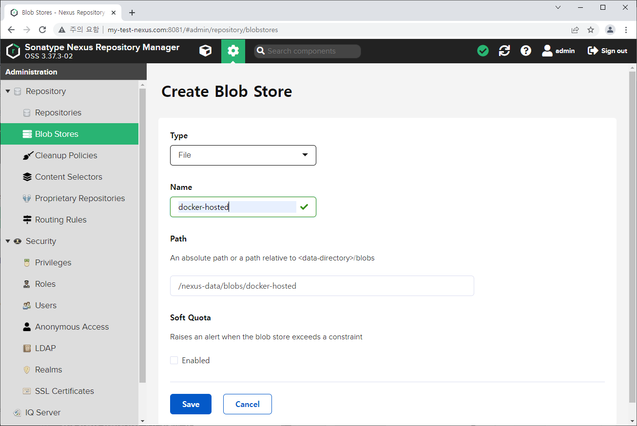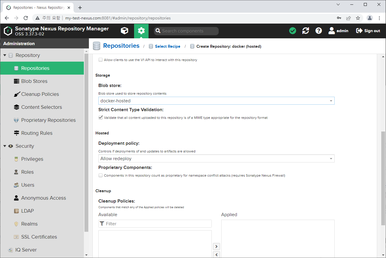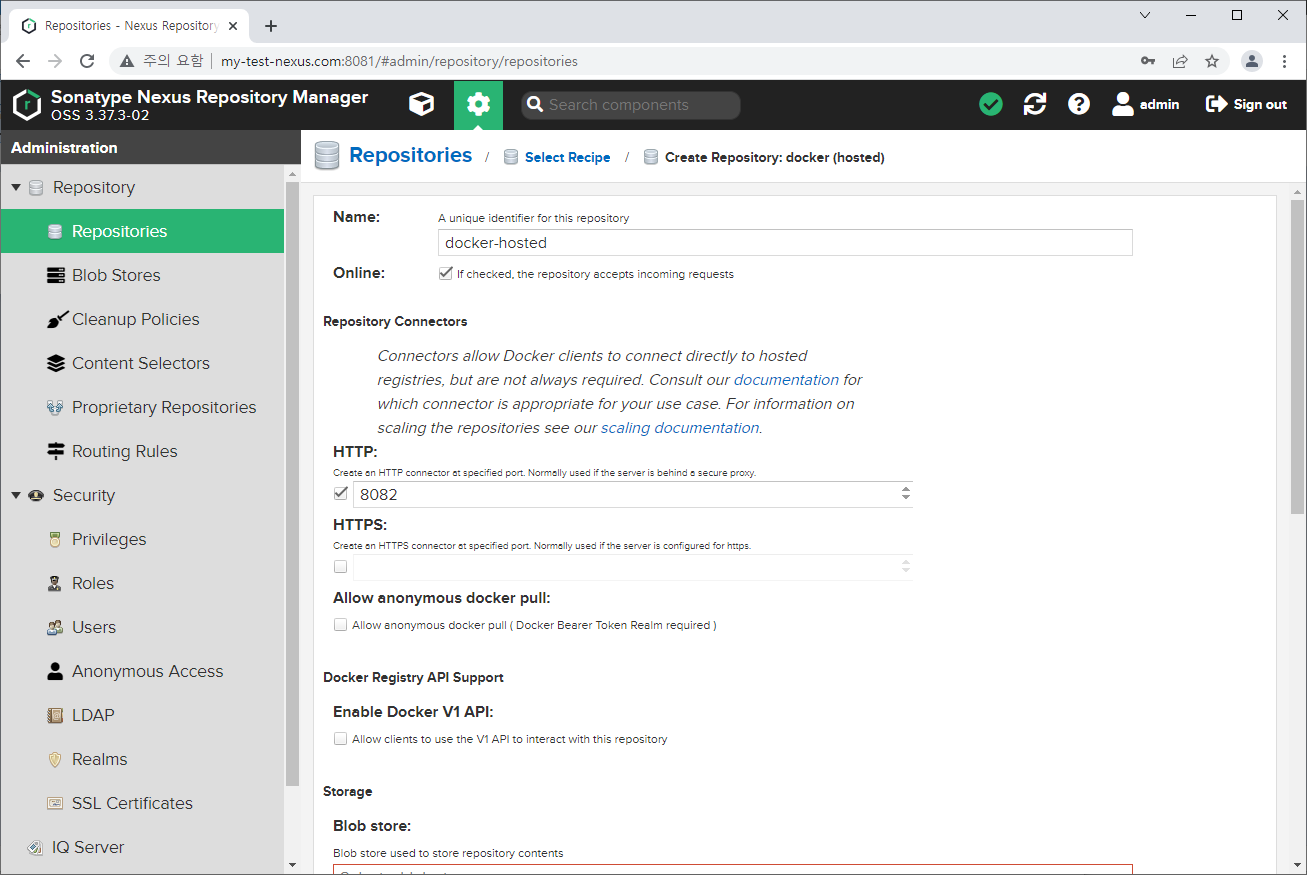 - Blob store: docker-hosted (위에서 만든 blob store 이다.)