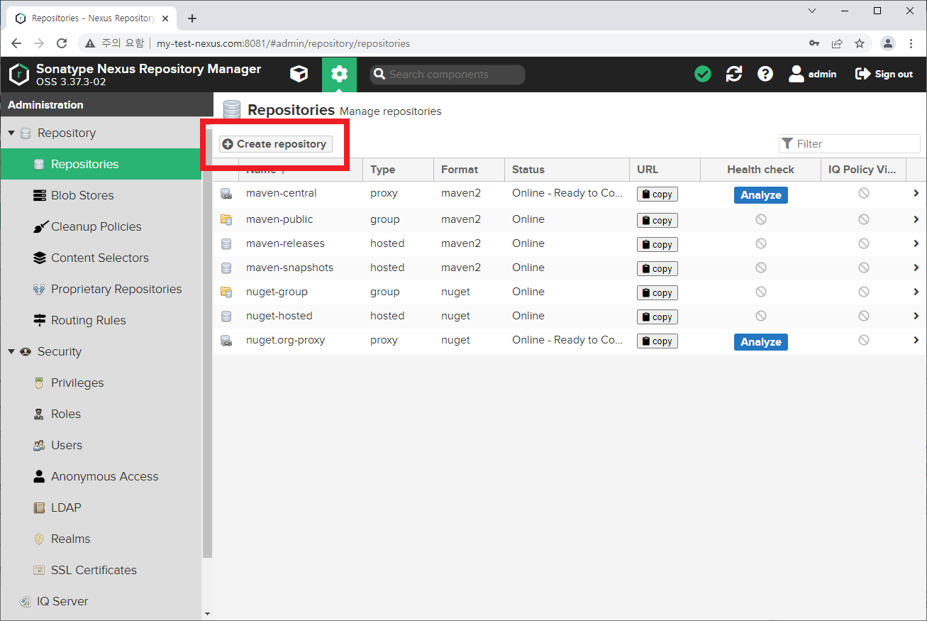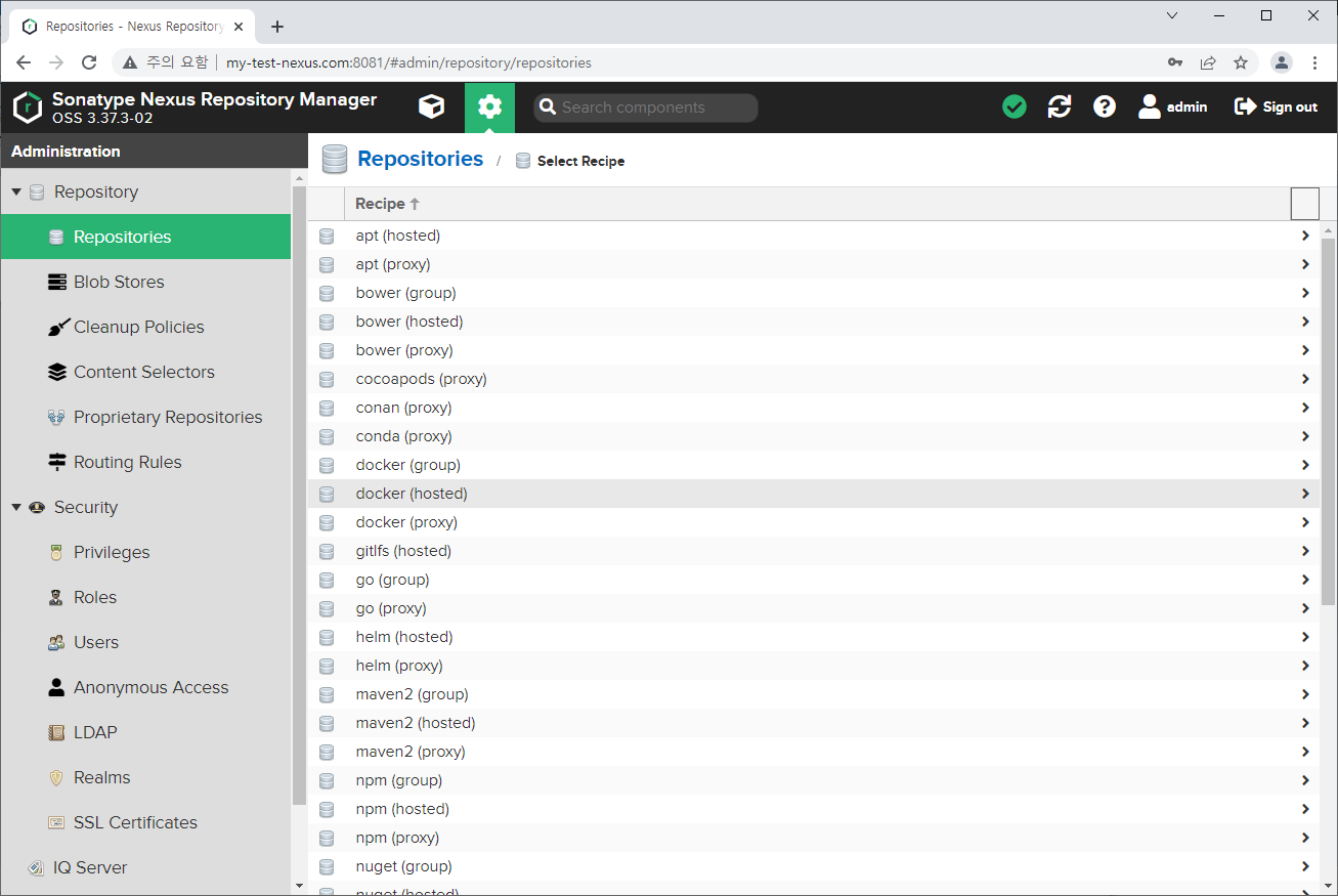 upstream nexus { server nexus:8081; # docker 로 띄운 nexus 컨테이너 이름 keepalive 8; } upstream nexus-docker-hosted { server nexus:8082; # docker 로 띄운 nexus 컨테이너 이름 keepalive 8; } server { listen 80; server_name my-test-nexus.com; location / { proxy_pass http://nexus; } } server { listen 443 ssl; server_name my-test-docker.com; ssl_certificate /etc/nginx/test-chained.crt; ssl_certificate_key /etc/nginx/test.key; location / { proxy_pass http://nexus-docker-hosted; client_max_body_size 2048m; # docker image 업로드시 필요한 업로드 용량 제한 늘리기 } }기타 nginx 설정이 필요하면 추가하도록 하자.