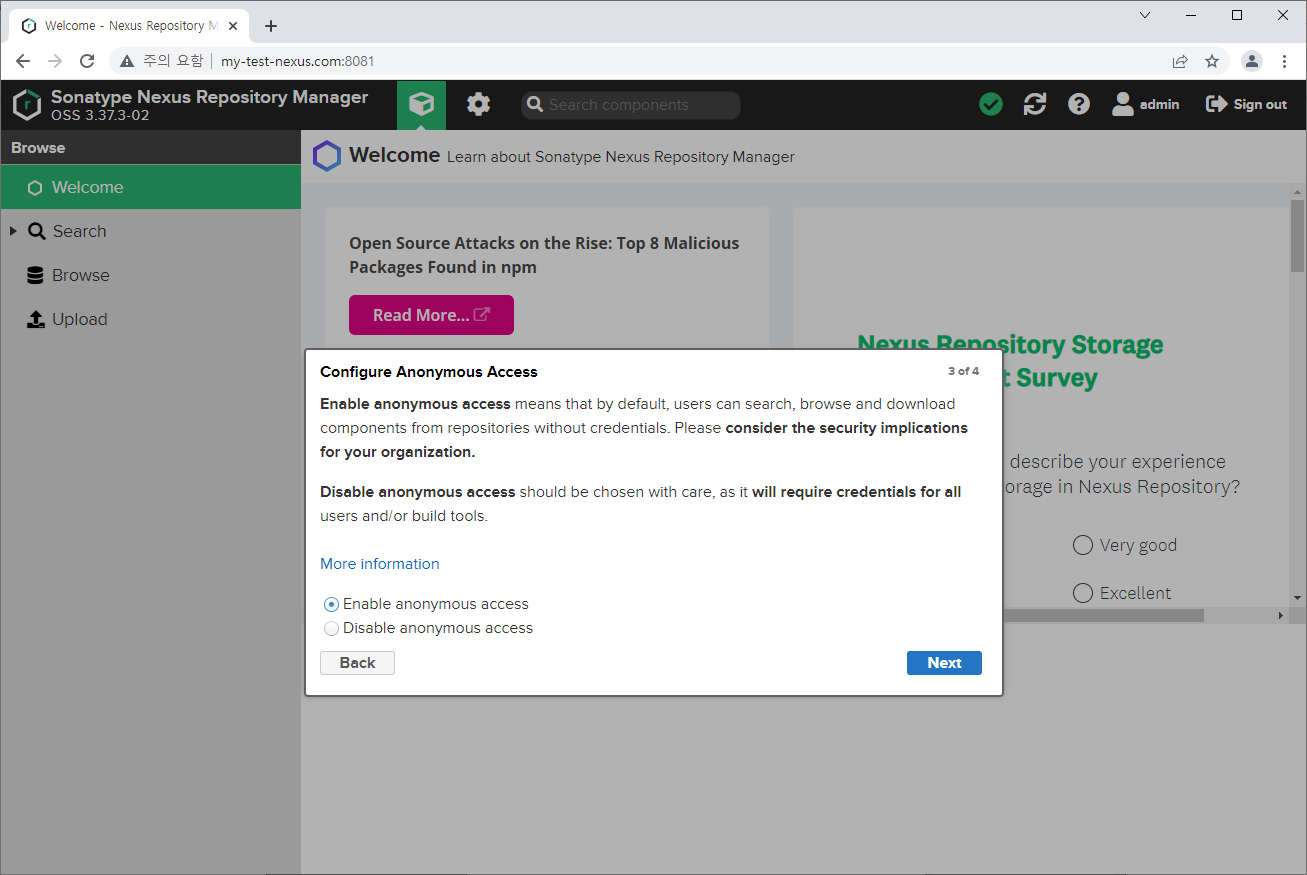 새로운 패스워드를 넣고 진행하자. Anonymous Access 에 대해서는 기본값(enable)으로 둔다.